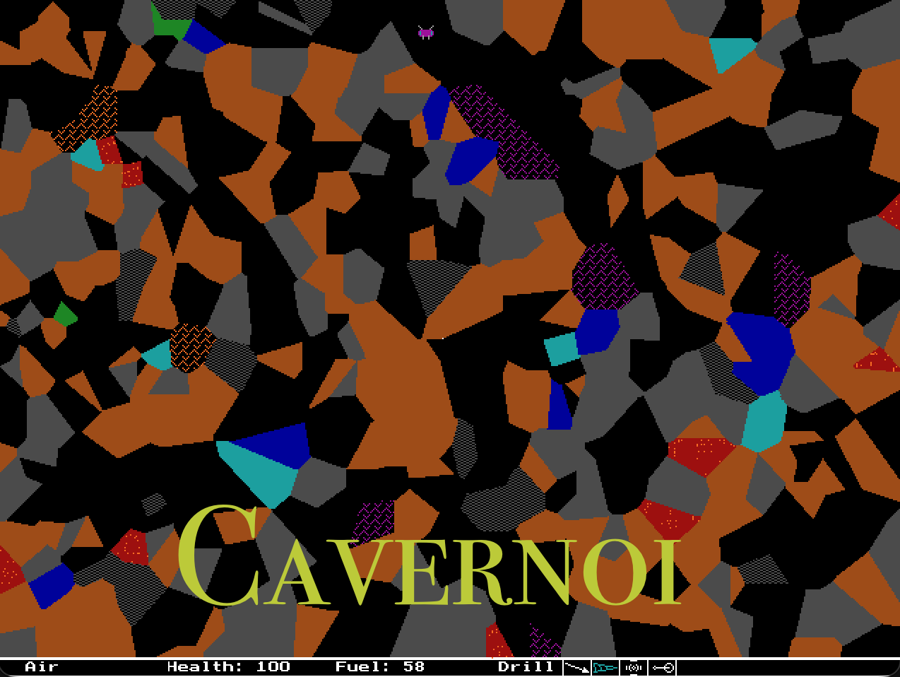There are solid, liquid, gaseous, hot, and radioactive materials, and tools to dig or drill, to remove a chunk as though it were never there, and to tug a chunk of material closer to you. Mouse controls movement (pathfinding with left button), tool selection (left-click a tool in the bottom bar), and tool use (right button on a chunk in range). Digging and drilling require being next to the chunk, while the others work at range. Dropping lava on yourself will harm your health, but nothing stops health going negative, so no need to be all that careful. Move off the right or bottom edges of the screen, by moving to them and then clicking close to the edge, to enter a new, more complex chamber each time.